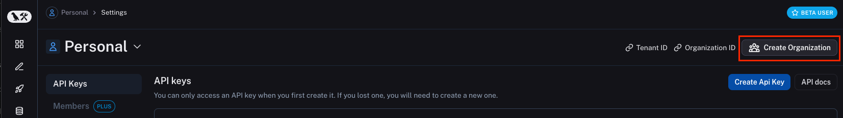 When you log in for the first time, a personal organization will be created for you automatically. If you'd like to collaborate with others, you can create a separate organization and invite your team members to join.