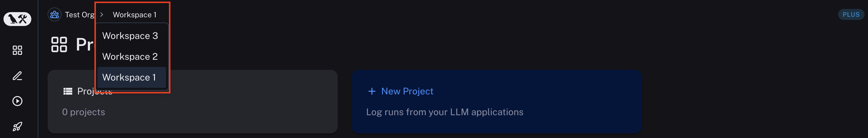 Once you've subscribed to a plan that allows for multiple users per organization, you can set up workspaces to collaborate more effectively and isolate LangSmith resources between different groups of users. To navigate between workspaces and access the resources within each workspace (trace projects, annotation queues, etc.), select the desired workspace from the picker in the top left: